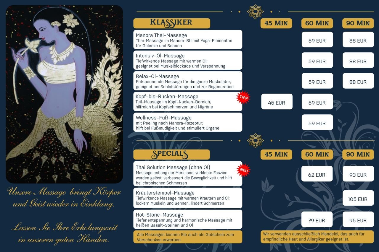 hier finden Sie die aktuell gültigen Preise für unsere Massagen. Bei unseren Klassikern gelten aktuell: